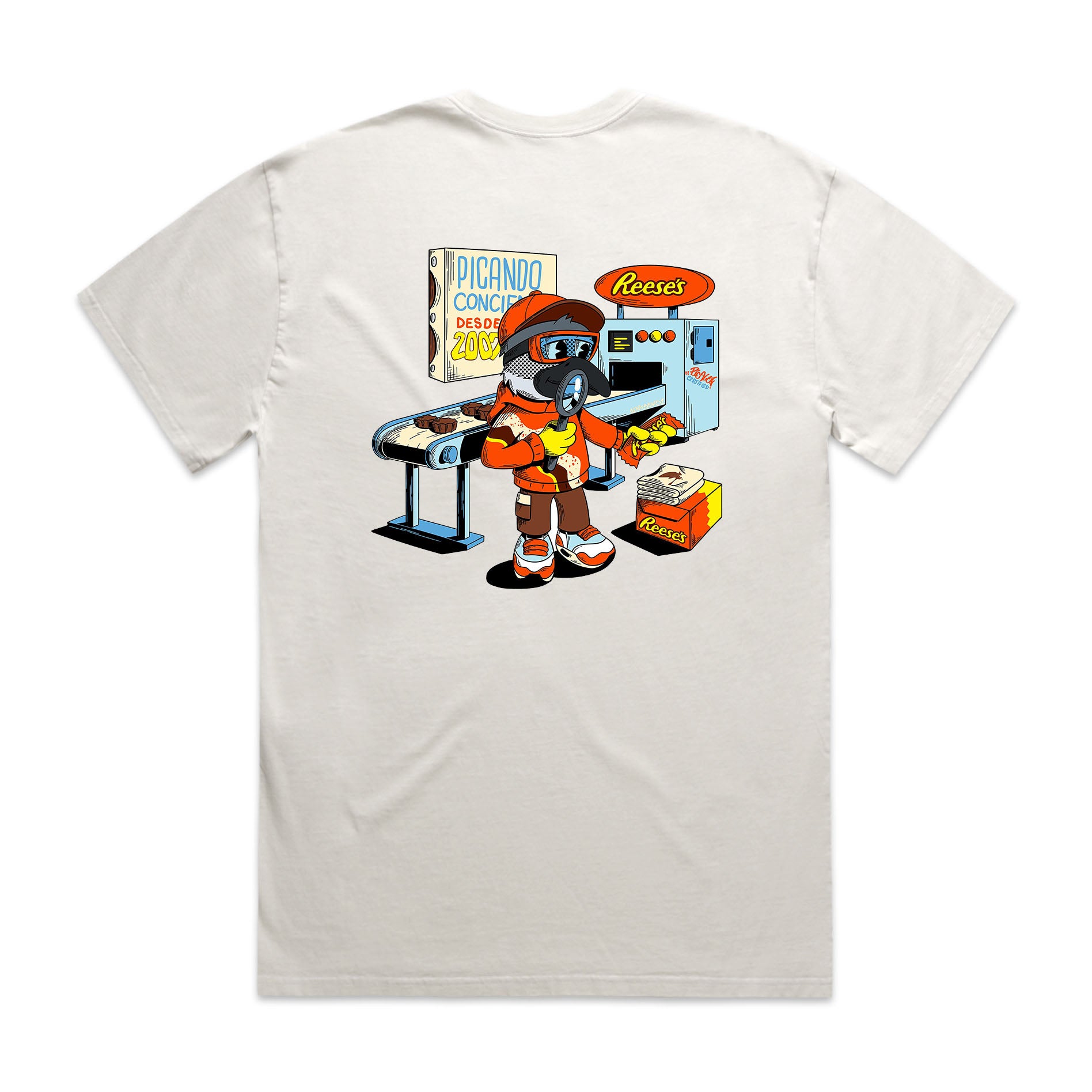 Este diseño muestra al Pitirre dentro de la fábrica de Reese’s, inspeccionando la línea de producción con una lupa.
