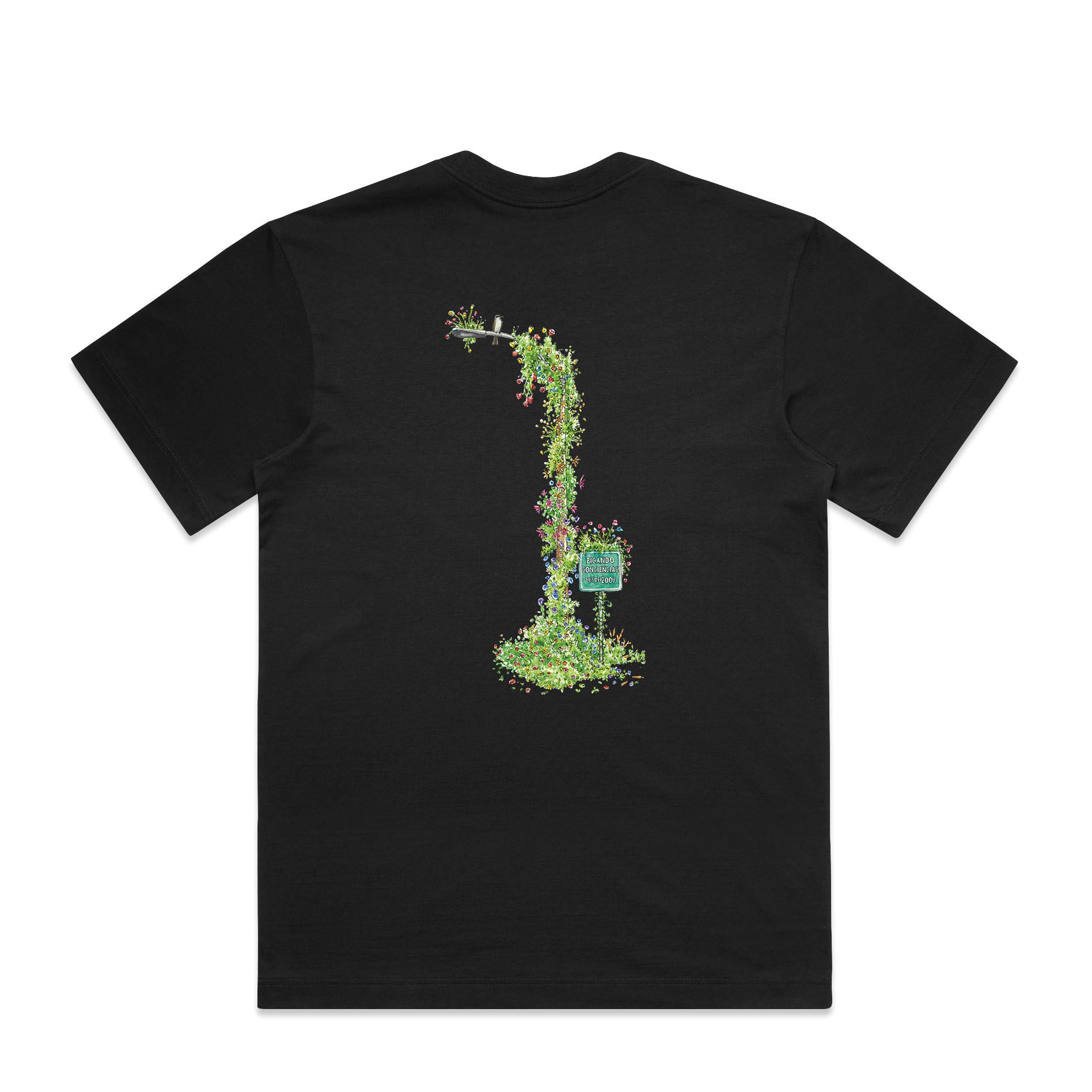 El arte vive en la parte trasera como pieza central. Al frente, el logo aparece contenido, rodeado por vegetación, casi reclamado por ella. Parte del drop El Pitirre Florista, una colección sobre dejar que las ideas crezcan incluso en los espacios más duros.